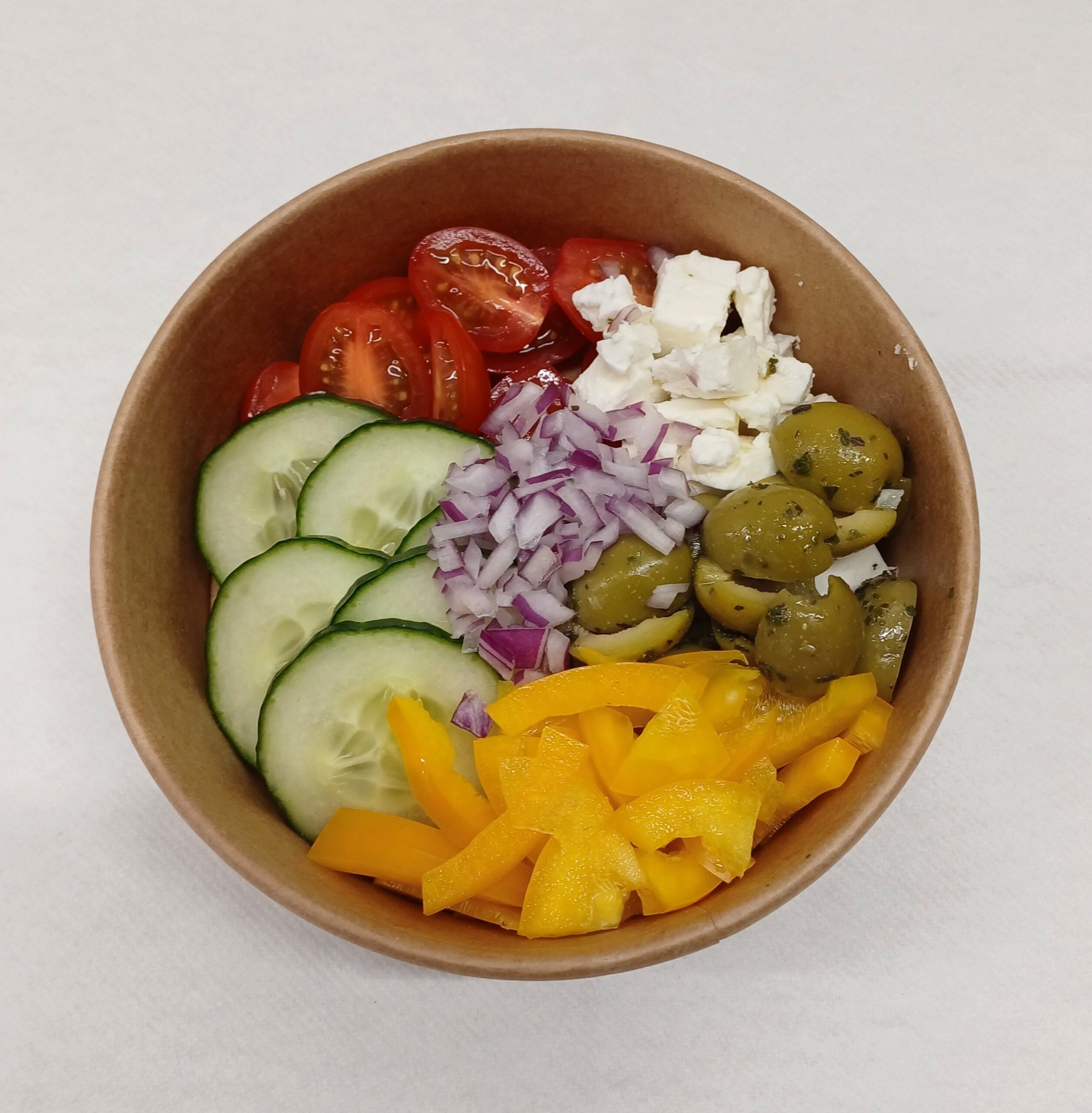 Ingrediënten: snoeptomaat,komkommer,gele paprika, rode ui, olijven 81%,zout,water,voedingszuren(melkzuur,citroenzuur),ongeharde plantaardige olien(zonnebloem,raapzaad in wisselende verhoudingen,basilicum 2,5%,knoflookstukjes(ongeharde plantaardige olien,zonnebloem),uipoeder,gedroogde basilicum 0,1%, conserveermiddel(kaliumsorbaat),gepasteuriseerde schapenMELK,gepasteuriseerde geitenMELK, melkfermenten,microbieel stremsel,peper,nootmuskaat,aromatische kruiden,tomatenvlokken,ui,rozemarijn,oregano,marjoram,knoflook(bevat van nature sulfieten) , kan sporen bevatten van PINDA’S en SELDERIJ