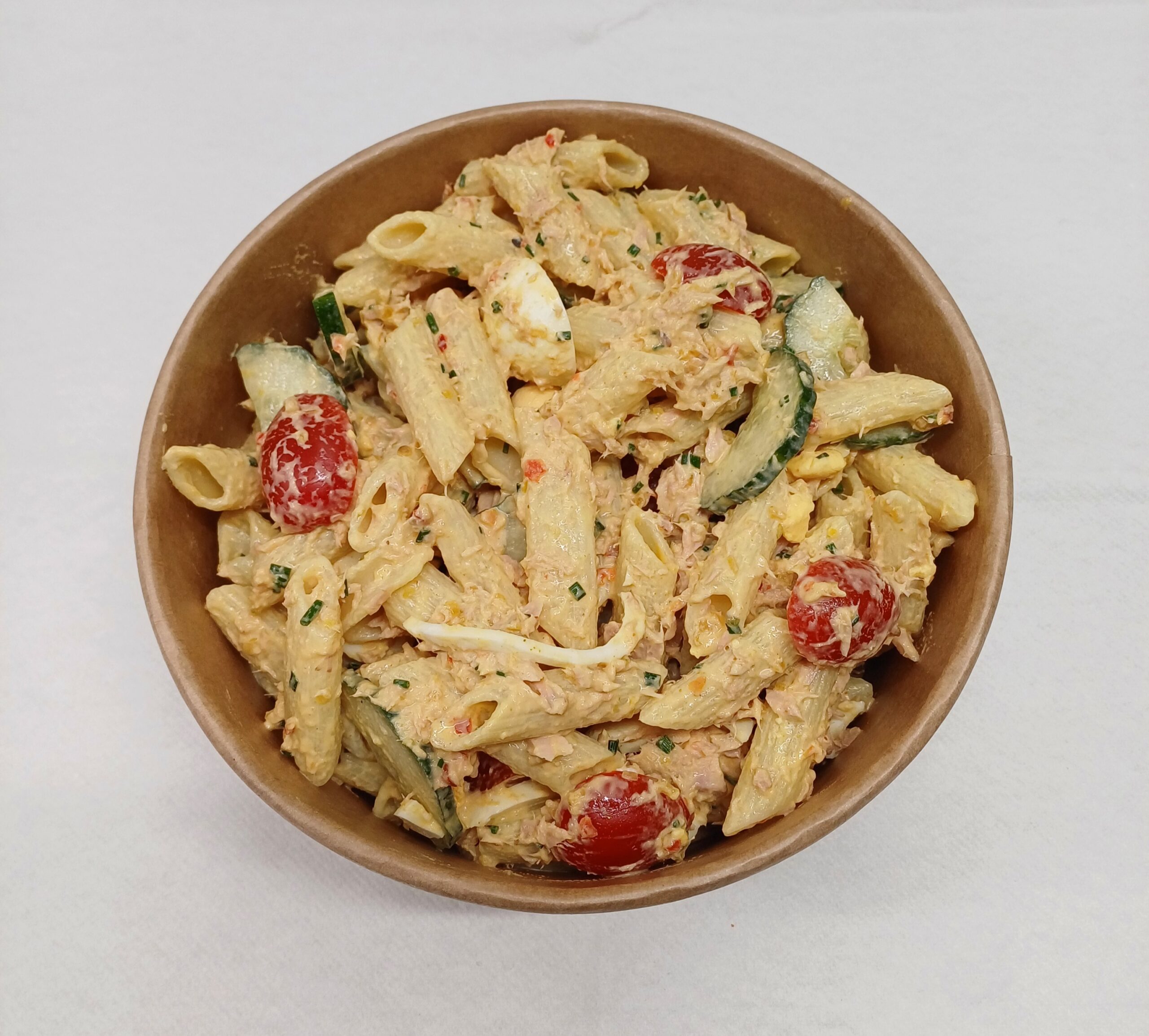 ingrediënten: pasta penne, tonijn,komkommer,tomaat,ei,bieslook,saladesaus(koolzaadolie,water,suiker,azijn,ui,paprika,scharrelEIgeel,maiszetmeel,zout,tomatenpuree,MOSTERD,specerijen,stabilisatoren E412,E410,E415,voedingszuur E270,specerijenextracten,conserveermiddel E202,E211,gemodificeerd maiszetmeel,kleurstof E160a,antioxidant E385,paprika-extract