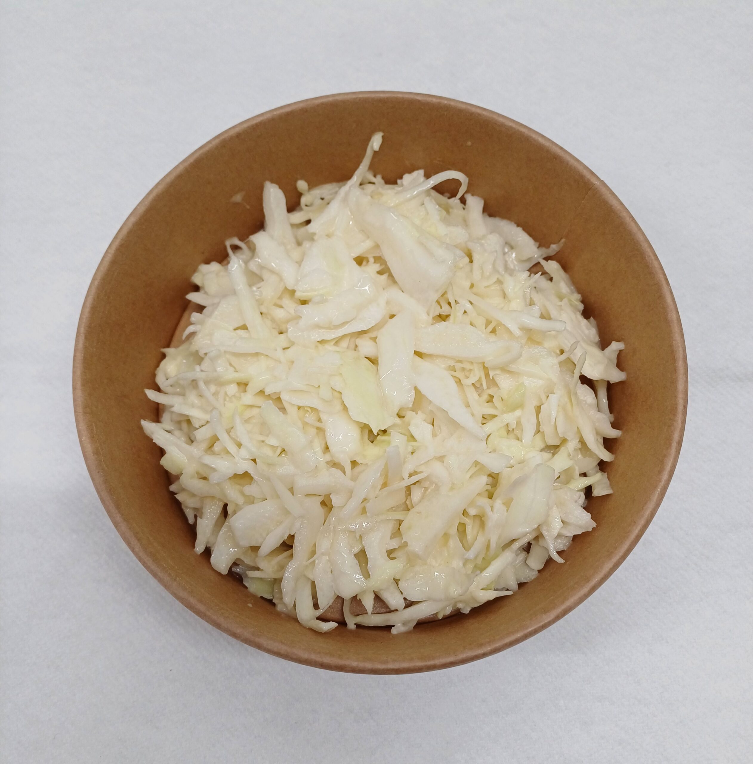 ingrediënten: witte kool,suiker,azijn, mayonaise(koolzaadolie,water,azijn,gemodificeerd maiszetmeel,MOSTERD(azijn,MOSTERDzaad,zout,kurkuma),Eigeel,suiker,voedingszuren E270,E575, stabilisator E415,conserveermiddelen E202,E211, specerijenextract,kleurstof E160a,antioxidant E385)